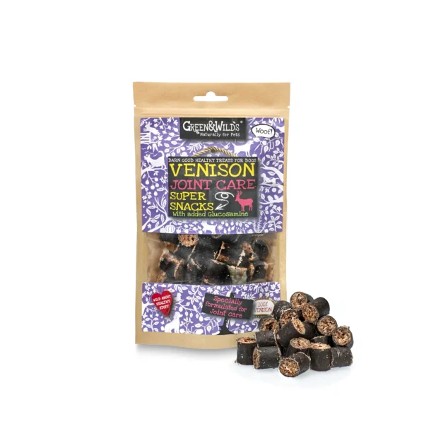 These 100% pure venison snacks with added glucosamine have been specially formulated to help dogs with joint problems. They are gluten free, hypoallergenic, with no added colours or preservatives. Glucosamine possesses natural anti-inflammatory and anti-aging properties and is a natural chemical compound found in your dog’s body which helps keep up the health of its cartilage – the rubbery tissue that cushions bones at the joints. As your dog gets older their levels of this compound begin to drop, leading to the gradual breakdown of the joint. This Glucosamine supplement snack helps keep up the good repair of these joints and eases joint stiffness. Venison has fewer calories, less fat and more iron than any other type of meat. It provides protein to help build strong bones and muscles and is very high in B vitamins, phosphorus, selenium, zinc and copper. They are air dried slowly in bite sized pieces to retain all the nutrients and are produced in the UK. This is a complimentary treat for your dog as part of a healthy, balanced diet. We recommend no more than 2 – 8 treats per day, depending on the size of your dog. Always ensure your pet has plenty of fresh drinking water available. Suitable for dogs from 6 months.
