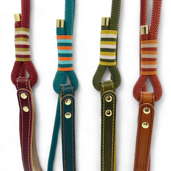 Supple leather handle with ultra-strong rope. Matching collars available.