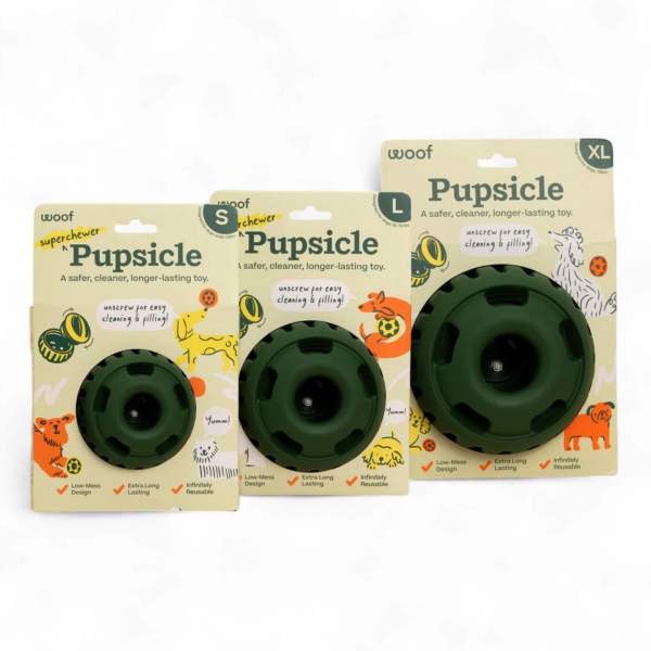 Keep your dog entertained, engaged, and soothed with the Pupsicle Green Edition. Designed for enrichment, simply fill with your dog’s favourite treats, freeze, and let them enjoy a long-lasting licking experience that helps reduce boredom and anxiety. Try the Woof Pupsicle Refills for longer lasting licking playtime.